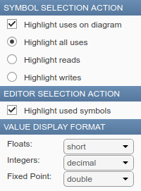 В режиме отладки значения всех данных отображаются в столбце ЗНАЧЕНИЕ (VALUE) панели Символы (Symbols). Поток состояний периодически обновляет значения при выполнении моделирования. Столбец значений выделяет изменения значений данных по мере внесения изменений. Если отладчик остановлен в точке останова, можно обновить начальное значение или изменить значение символов в командной строке или на панели «Символы».