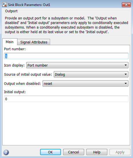 Дважды щелкните блок вывода подсистемы, чтобы открыть диалоговое окно «Параметры блока».