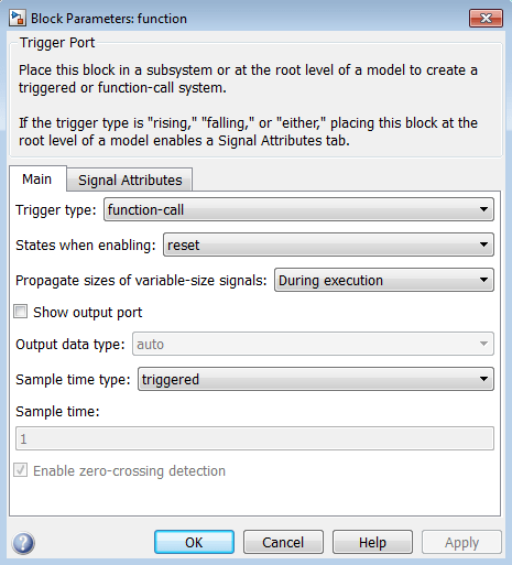 Тип времени выборки: triggered. Этот параметр задает выполнение подсистемы вызова функций только в том случае, если она инициируется вызывающим событием, когда она активизирована.
