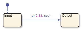at для временной логики абсолютного времени в диаграммах в моделях SimulinkВ диаграммах в модели Simulink с использованием at как оператор временной логики абсолютного времени не поддерживается. Вместо этого используйте after оператор. Например, предположим, что требуется определить временную задержку с помощью выражения at(5.33, sec).