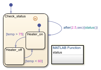 every для временной логики абсолютного времени в диаграммах в моделях SimulinkВ диаграммах в модели Simulink с использованием every как оператор временной логики абсолютного времени не поддерживается. Вместо этого используйте переход внешней петли с after оператор. Например, предположим, что во время выполнения диаграммы необходимо печатать сообщение о состоянии активного состояния каждые 2,5 секунды.