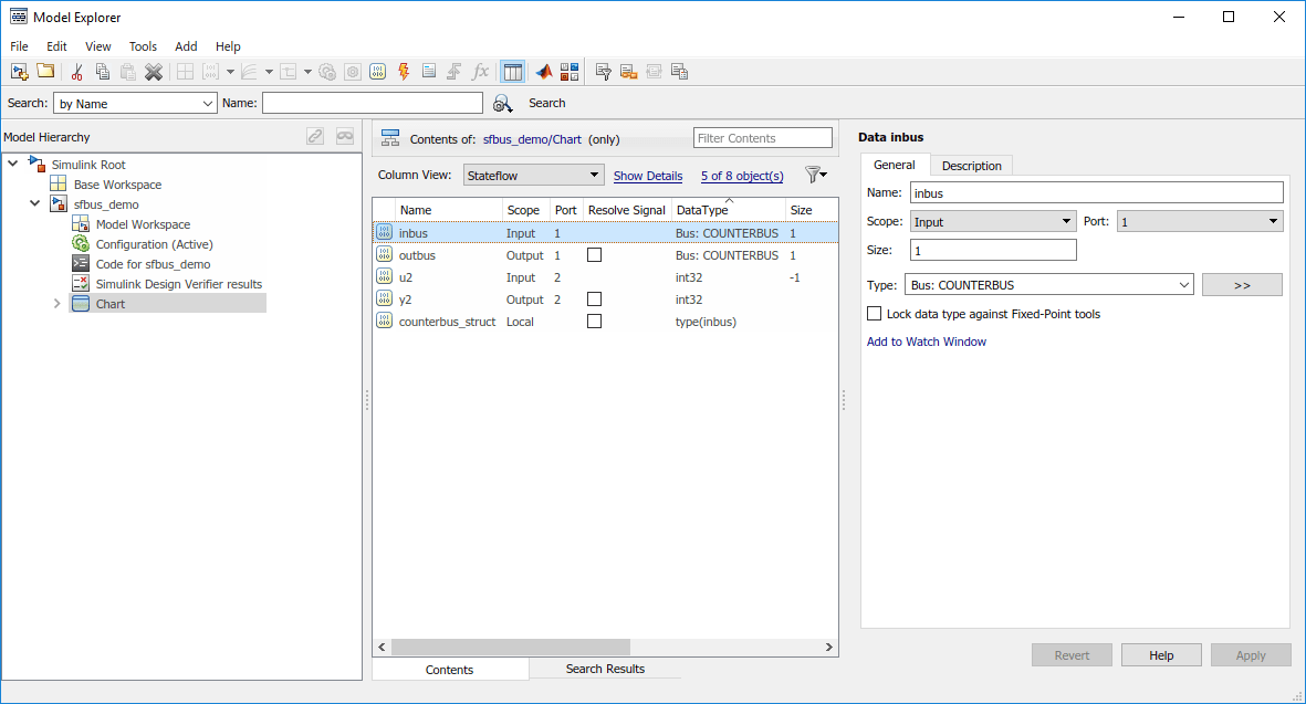Если щелкнуть запись на панели Иерархия модели (Model Hierarchy), эта запись будет выделена и отображены ее дочерние объекты на панели Содержимое (Contents). После метки Содержимое (Contents) в верхней части панели Содержимое (Contents) появляется гипертекстовая ссылка на выбранный объект на панели Иерархия модели (Model Hierarchy). Щелкните эту ссылку, чтобы отобразить этот объект в собственном редакторе. В предыдущем примере щелкните ссылку sfbus_demo/Chart отображает содержимое диаграммы в ее редакторе.