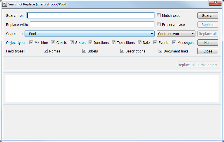 При нажатии кнопки Заменить все в этом объекте все экземпляры текста, соответствующие полю Поиск, заменяются текстом, введенным в поле Заменить на везде в текущем объекте Stateflow независимо от предыдущих поисков.