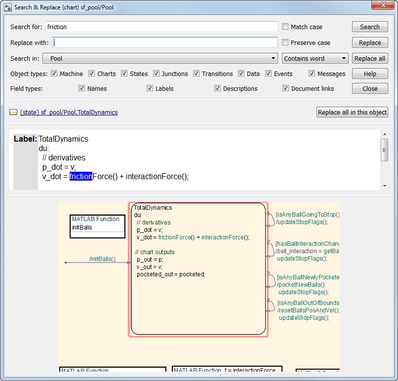 В области просмотра диалогового окна «Поиск и замена» отображается соответствующий текст и содержащий его объект, если он доступен для просмотра. В предыдущем примере взято из sf_pool модель, поиск слова "friction" находит поле Описание для состояния TotalDynamics. Результирующая область вида состоит из следующих частей: