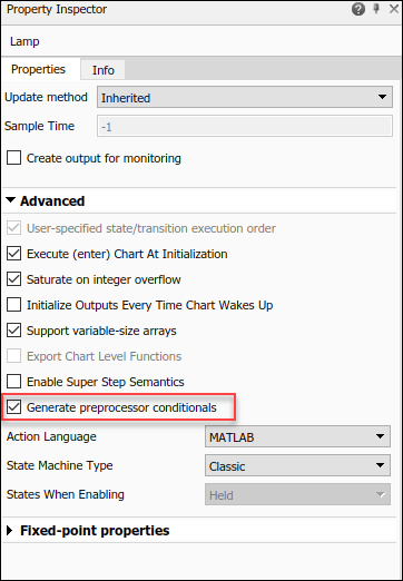 При использовании встроенного кодера можно включить условную инструкцию препроцессора в созданный код. В редакторе потока состояний на вкладке «Моделирование» в разделе «Данные проекта» выберите «Инспектор свойств». В разделе Дополнительно выберите Генерировать условия препроцессора.