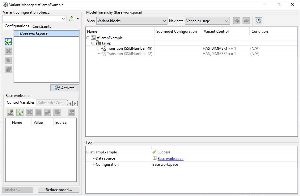 В этом примере конфигурации вариантов добавляются в базовую систему управления, которая включает и выключает лампу. Конфигурации вариантов позволяют затухать лампе несколькими способами. После добавления конфигураций вариантов в диаграмму Stateflow можно выбрать создание кода для любой конфигурации.