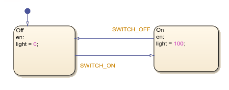 Первоначально диаграмма Stateflow включает два состояния: Off и On. Свет включается, когда событие, SWITCH_ON, отправляется в диаграмму. Свет выключается, когда событие, SWITCH_OFF, отправляется в диаграмму.