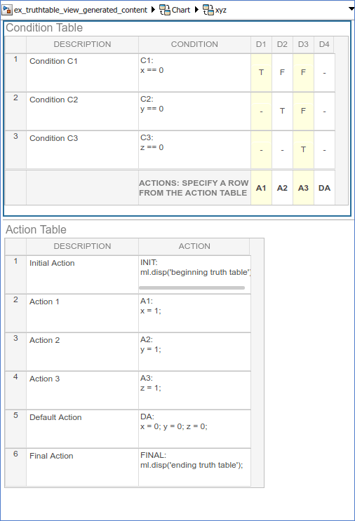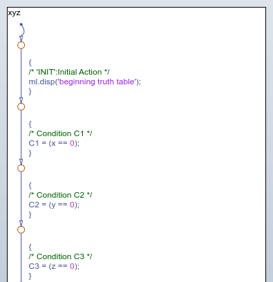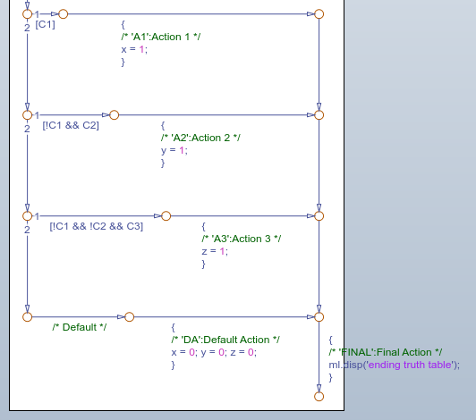 Программа Stateflow генерирует содержимое таблиц истинности MATLAB в виде кода MATLAB, который представляет каждое действие как вложенную функцию в основной функции таблицы истинности.