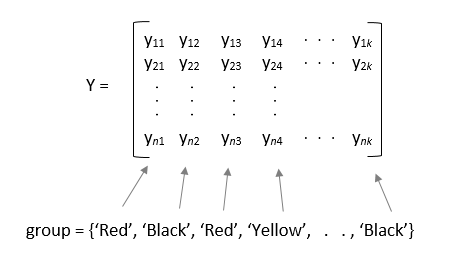 Пример: 'group',{'white','red','white','black','red'} когда y - матрица с пятью столбцами, разделенными на группы: красный, белый и черный