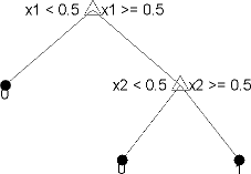 Это дерево предсказывает классификации на основе двух предикторов, x1 и x2. Чтобы предсказать, начните с верхнего узла. При каждом решении проверьте значения предикторов, чтобы решить, за какой ветвью следует. Когда ветви достигают конечного узла, данные классифицируются как тип 0 или 1.