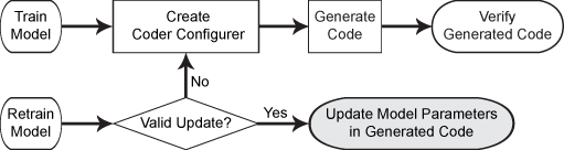 Создание кода C/C + + для predict и update функции модели машинного обучения с использованием объекта конфигуратора кодера. Создать этот объект с помощью learnerCoderConfigurer и его объектная функция generateCode. Тогда вы можете использовать update для обновления параметров модели в сгенерированном коде без необходимости регенерации кода. Эта функция уменьшает усилия, необходимые для регенерации, повторного развертывания и восстановления кода C/C + + при переподготовке модели с новыми данными или настройками.