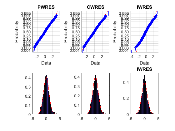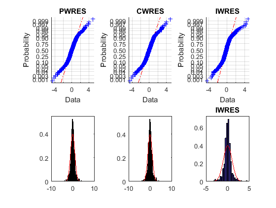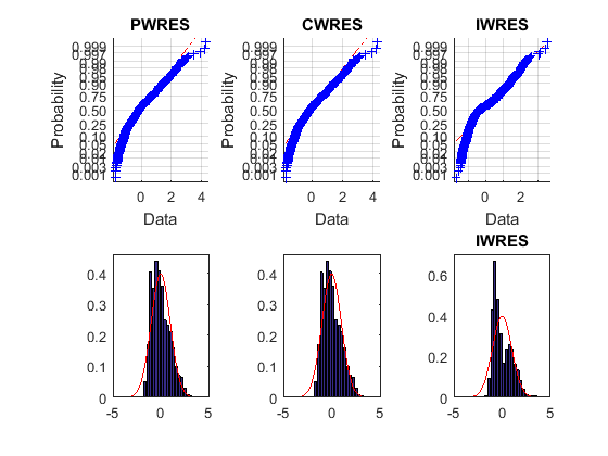 function plotResiduals(stats) pwres = stats.pwres; iwres = stats.iwres; cwres = stats.cwres; figure subplot(2,3,1); normplot(pwres); title('PWRES') subplot(2,3,4); createhistplot(pwres); subplot(2,3,2); normplot(cwres); title('CWRES') subplot(2,3,5); createhistplot(cwres); subplot(2,3,3); normplot(iwres); title('IWRES') subplot(2,3,6); createhistplot(iwres); title('IWRES') function createhistplot(pwres) h = histogram(pwres); % x is the probability/height for each bin x = h.Values/sum(h.Values*h.BinWidth) % n is the center of each bin n = h.BinEdges + (0.5*h.BinWidth) n(end) = []; bar(n,x); ylim([0 max(x)*1.05]); hold on; x2 = -4:0.1:4; f2 = normpdf(x2,0,1); plot(x2,f2,'r'); end end