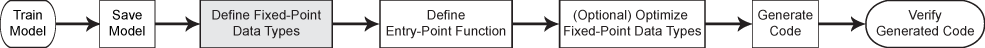 На этой блок-схеме показан рабочий процесс создания кода с фиксированной точкой для predict функция модели машинного обучения. Использовать generateLearnerDataTypeFcn для выделенного шага.