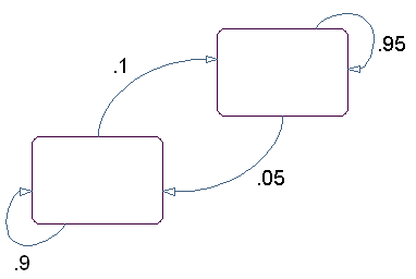 TRANS TRANS = 0.9000 0.1000 0.0500 0.9500 EMIS EMIS = 0.1667 0.1667 0.1667 0.1667 0.1667 0.1667 0.5833 0.0833 0.0833 0.0833 0.0833 0.0833