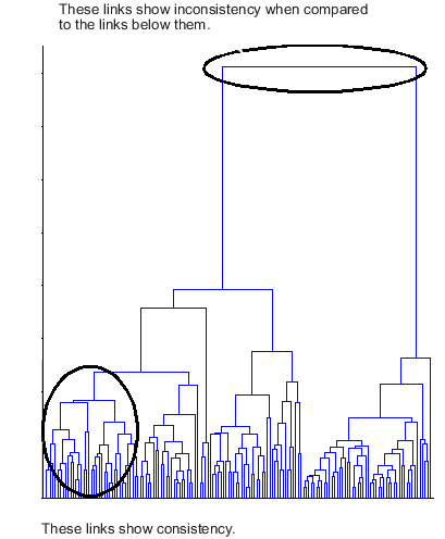 Одним из способов определения естественных делений кластера в наборе данных является сравнение высоты каждого звена в дереве кластера с высотами соседних звеньев под ним в дереве.