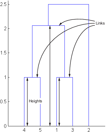 На рисунке числа вдоль горизонтальной оси представляют индексы объектов в исходном наборе данных. Связи между объектами представлены в виде U-образных линий вверх-вниз. Высота U указывает расстояние между объектами. Например, линия связи, представляющая кластер, содержащий объекты 1 и 3, имеет высоту 1. Связь, представляющая кластер, который группирует объект 2 вместе с объектами 1, 3, 4 и 5 (которые уже сгруппированы как объект 8), имеет высоту 2,5. Высота представляет расстояние linkage вычисляет между объектами 2 и 8. Для получения дополнительной информации о создании диаграммы дендрограммы см. dendrogram справочная страница.
