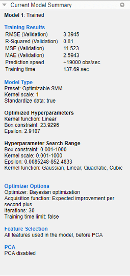 После выбора определенного типа модели для обучения, например дерева решений или машины вектора поддержки (SVM), можно настроить модель, выбрав различные расширенные опции. Например, можно изменить минимальный размер листа дерева решений или ограничение поля SVM. Некоторые из этих опций являются внутренними параметрами модели или гиперпараметрами, которые могут сильно повлиять на ее производительность. Вместо выбора этих параметров вручную можно использовать оптимизацию гиперпараметров в приложении Regression Learner для автоматизации выбора значений гиперпараметров. Для данного типа модели приложение пытается использовать различные комбинации значений гиперпараметров, используя схему оптимизации, которая стремится минимизировать среднеквадратичную ошибку модели (MSE), и возвращает модель с оптимизированными гиперпараметрами. Результирующую модель можно использовать так же, как и любую другую обученную модель.