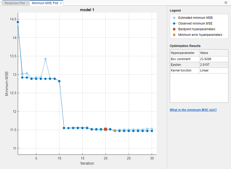 Оптимизированные гиперпараметры не всегда обеспечивают наблюдаемый минимальный MSE. Когда приложение выполняет гиперпараметрическую настройку с помощью байесовской оптимизации (краткое введение см. в разделе Опции оптимизации), оно выбирает набор значений гиперпараметров, который минимизирует верхний доверительный интервал целевой модели MSE, а не набор, который минимизирует MSE. Дополнительные сведения см. в разделе 'Criterion','min-visited-upper-confidence-interval' аргумент пары имя-значение bestPoint.