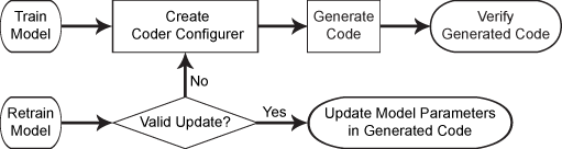 Создание конфигуратора кодера с помощью learnerCoderConfigurer, создать код с помощью generateCode, а затем проверьте созданный код. Параметры генерации кода и атрибуты кодера параметров модели можно настроить с помощью свойств объекта. После переподготовки модели с новыми данными или настройками можно обновить параметры модели в сгенерированном коде C/C + + без необходимости регенерации кода. Эта функция уменьшает усилия, необходимые для регенерации, повторного развертывания и восстановления кода C/C + +.
