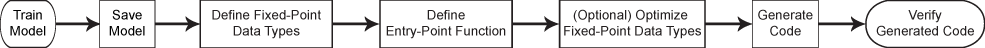 Создание кода с фиксированной точкой требует дополнительного шага, который определяет типы данных с фиксированной точкой переменных, необходимых для прогнозирования. Создание структуры типа данных с фиксированной точкой с помощью функции типа данных, созданной generateLearnerDataTypeFcnи использовать структуру в качестве входного аргумента loadLearnerForCoder в функции точки входа. Перед созданием кода можно также оптимизировать типы данных с фиксированной точкой.