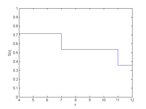 Вот как можно ввести данные и вычислить эти показатели с помощью ecdf. Данные необязательно должны быть в порядке возрастания. Предположим, что время отказа хранится в массиве y.