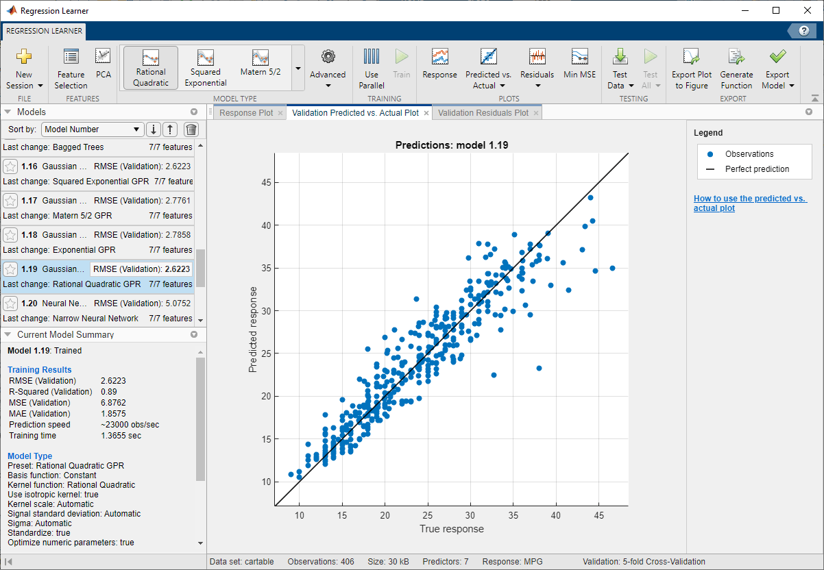Изучите свои данные, выберите функции и визуализируйте результаты. Аналогично Classification Learner, функция Regression Learner применяет перекрестную проверку по умолчанию. Результаты и визуализации отражают проверенную модель. Используйте результаты для выбора наилучшей модели для данных.