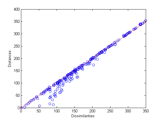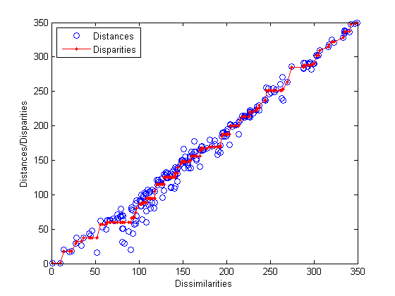 xlabel('Dissimilarities'); ylabel('Distances/Disparities')