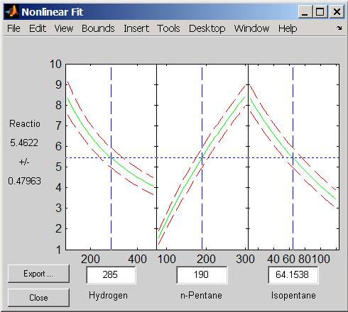 nlintool(X,y,fun,beta0) является графическим интерфейсом пользователя для nlinfit и использует те же входные аргументы. Интерфейс отображает графики подогнанного ответа против каждого предиктора, при этом другие предикторы остаются фиксированными. Фиксированные значения находятся в текстовых полях под каждой осью предиктора. Измените фиксированные значения, введя новое значение или перетащив вертикальные линии на графиках в новые позиции. При изменении значения предиктора все графики обновляются для отображения модели в новой точке пространства предиктора. Пунктирные красные кривые показывают 95% одновременных доверительных полос для функции.