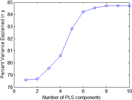 Использовать plsregress для выполнения регрессии ПЛС с тем же количеством компонентов, что и предикторы, затем постройте график процентной дисперсии, объясненной в ответе как функция количества компонентов: