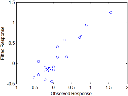 Рассеяние показывает разумную корреляцию между подходящими и наблюдаемыми ответами, и это подтверждается R2 статистикой: