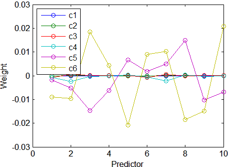 0.8421График весов десяти предикторов в каждом из шести компонентов показывает, что два компонента (последние два вычисленных) объясняют большую часть дисперсии в X: