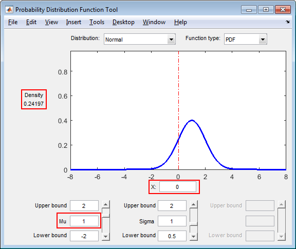 Parameters - Границы и значения параметровУкажите границы параметров и значения в виде числовых значений. Каждый столбец содержит поле для верхней границы, значения и нижней границы одного параметра. Имя и количество доступных параметров изменяются в зависимости от распределения, указанного в выпадающем списке Распределение. Например, если выбрать Normal распределение, затем disttool включает два столбца: один столбец для параметра Mu и один столбец для параметра Sigma. Если выбрано экспоненциальное распределение, то disttool включает один столбец для параметра Mu.