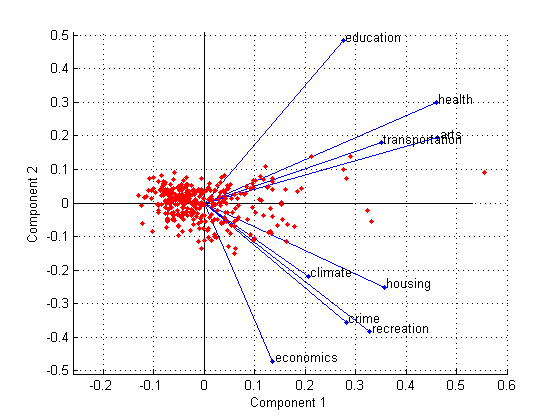 Все девять переменных представлены в этом двумерном графике вектором, и направление и длина вектора указывают, как каждая переменная вносит вклад в два главных компонента графика. Например, первый главный компонент на горизонтальной оси имеет положительные коэффициенты для всех девяти переменных. Именно поэтому девять векторов направлены в правую половину графика. Наибольшими коэффициентами в первом главном компоненте являются третий и седьмой элементы, соответствующие переменным. health и arts.