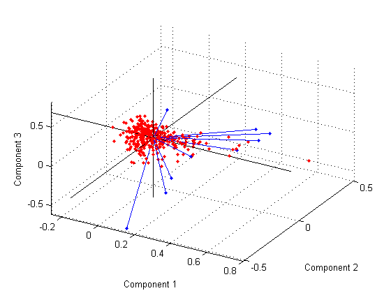 Этот график полезен, если первые две основные координаты недостаточно объясняют дисперсию в данных. Чтобы повернуть фигуру под разными углами, выберите команду Инструменты >Rotate 3D.