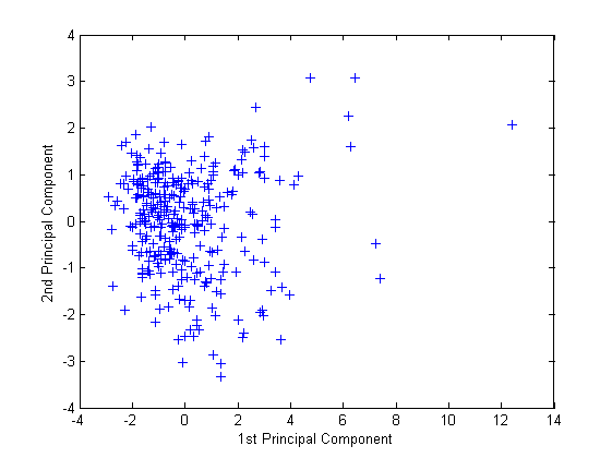 figure() plot(score(:,1),score(:,2),'+') xlabel('1st Principal Component') ylabel('2nd Principal Component')