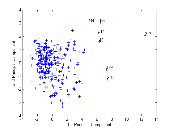 Последний вывод из pca является tsquared, что является T2 Хотеллинга, статистической мерой многомерного расстояния каждого наблюдения от центра набора данных. Это аналитический способ найти самые экстремальные точки в данных.