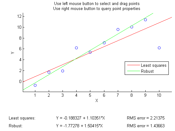 На полученном рисунке показан график рассеяния с двумя подогнанными линиями. Красная линия - это аппроксимация с использованием обычной регрессии методом наименьших квадратов. Зеленая линия - это посадка с использованием надежной регрессии. В нижней части рисунка приведены уравнения для аппроксимированных линий вместе с оцененными среднеквадратичными ошибками корня для каждой аппроксимации.