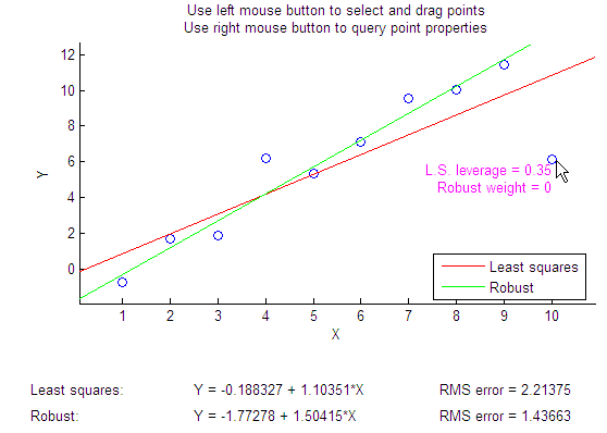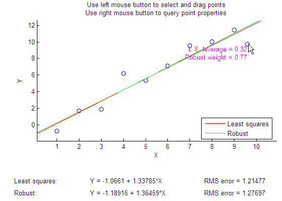 Используйте правую кнопку мыши, чтобы щелкнуть по точке и просмотреть ее рычаги наименьших квадратов и надежный вес.