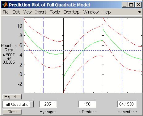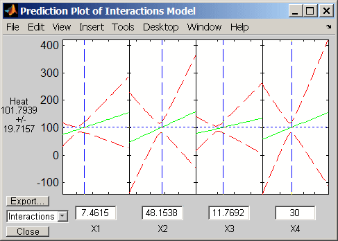 Отображается последовательность графиков, каждая из которых показывает контур ответной поверхности относительно одного предиктора, при этом все другие предикторы остаются фиксированными. rstool строит график 95% одновременной доверительной полосы для подогнанной поверхности отклика в виде двух красных кривых. Предикторные значения отображаются в текстовых полях на горизонтальной оси и отмечены вертикальными пунктирными синими линиями на графиках. Значения предиктора изменяются путем редактирования текстовых полей или перетаскивания пунктирных синих линий. При изменении значения предиктора все графики обновляются, чтобы показать новую точку в пространстве предиктора.