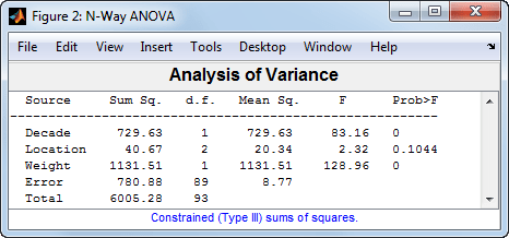 anovan(MPG,{Decade,Location,Weight},'Continuous',3,...