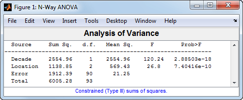 Этот результат показывает результаты двусторонней ANOVA. P-значение для проверки равенства эффектов десятилетия составляет 2.88503e-18таким образом, нулевая гипотеза отвергается на уровне значимости 0,05. P-значение для проверки равенства эффектов местоположения равно 7.40416e-10, поэтому эта нулевая гипотеза также отвергается.