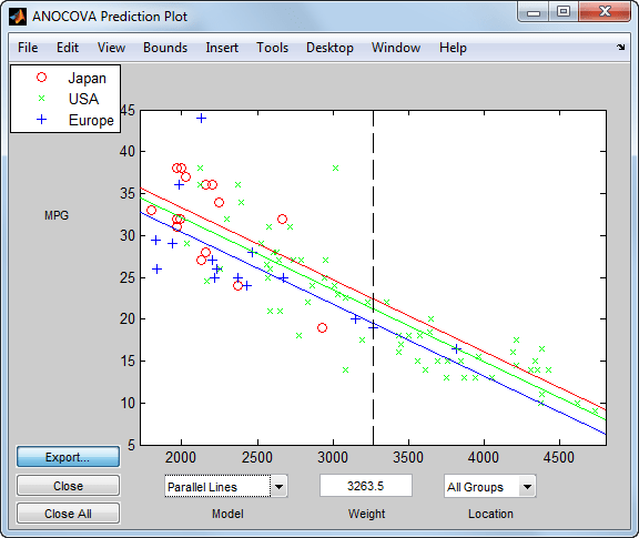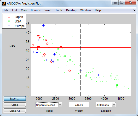 Эти выходные данные показывают, что если вы не включаете Weight в модели существуют довольно большие различия в ожидаемых милях на галлон среди трех производственных местоположений. При этом модель не корректируется на десятилетие производства.