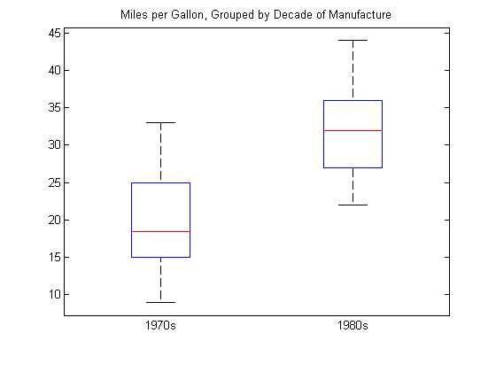 MPG70 = MPG(Decade=='1970s'); MPG80 = MPG(Decade=='1980s'); [h,p] = ttest2(MPG70,MPG80)