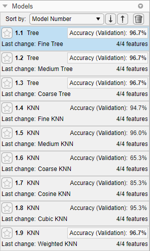 Выбор типов модели появляется на панели Модели (Models). По окончании обучения в рамке выделяется наилучший процент оценки точности (проверки).