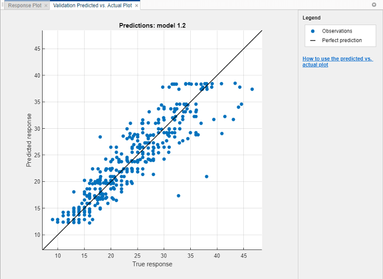 Постройте график прогнозируемого ответа в сравнении с истинным ответом. На вкладке Обучающийся регрессии (Regression Learner) в разделе Графики (Plots) щелкните Прогнозируемые и фактические (Predicted vs. Actual) и выберите Данные проверки (Validation Data). Используйте этот график, чтобы понять, насколько хорошо регрессионная модель делает прогнозы для различных значений отклика.
