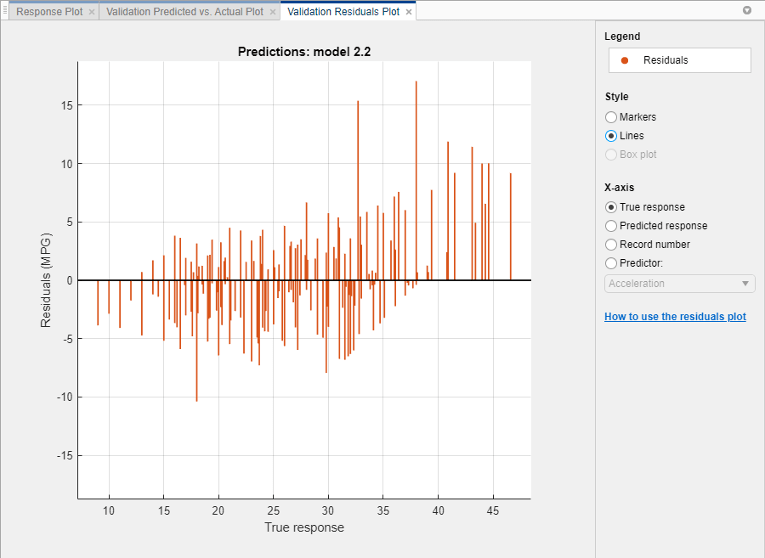 Выберите лучшую модель на панели Модели (Models) и просмотрите график остатков. На вкладке «Обучающийся регрессии» в разделе «Графики» щелкните «Остатки» и выберите «Данные проверки». График остатков отображает разницу между предсказанными и истинными откликами. Для отображения остатков в виде графика линий в разделе «Стиль» выберите «Линии».