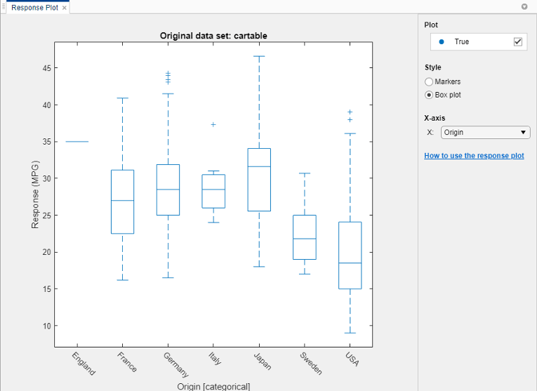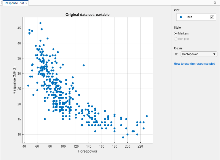 Используйте график ответа, чтобы выяснить, какие переменные полезны для прогнозирования ответа. Чтобы визуализировать связь между различными предикторами и ответом, выберите различные переменные в списке X под осью X.