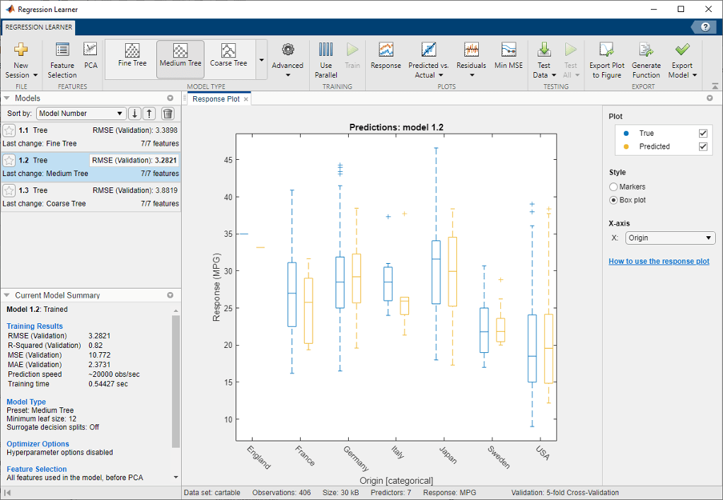В этом примере показано, как создавать и сравнивать различные деревья регрессии с помощью приложения Regression Learner и экспортировать обученные модели в рабочую область для прогнозирования новых данных.
