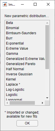 Чтобы импортировать настраиваемый дистрибутив с помощью приложения, выберите «Файл» > «Импортировать настраиваемые дистрибутивы». Откроется диалоговое окно Импортированные распределения (Imported Distributions), в котором можно выбрать файл, определяющий распределение. Например, при создании файла LaplaceDistribution.m, как описано в предыдущем разделе, список в диалоговом окне включает Laplace за которым следует звездочка, указывающая на то, что файл является новым или измененным и доступным для фитинга.