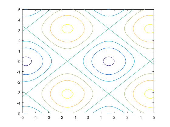 syms x y fcontour(x*sin(y)-y*cos(x), [-2*pi 2*pi]) grid on title('xsin(y)-ycos(x) for -2\pi < x < 2\pi and -2\pi < y < 2\pi') xlabel('x') ylabel('y') ax = gca; S = sym(ax.XLim(1):pi/2:ax.XLim(2)); ax.XTick = double(S); ax.XTickLabel = arrayfun(@texlabel, S, 'UniformOutput', false); S = sym(ax.YLim(1):pi/2:ax.YLim(2)); ax.YTick = double(S); ax.YTickLabel = arrayfun(@texlabel, S, 'UniformOutput', false);